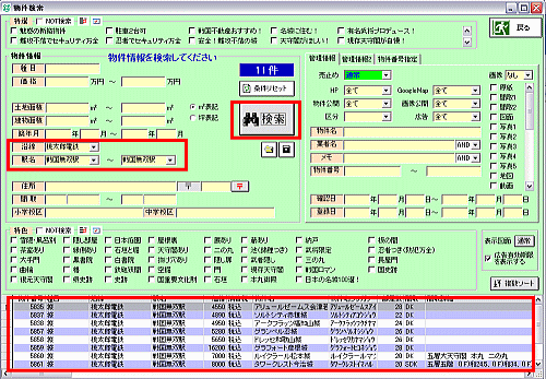 @dream「メインメニュー」>「チラシ印刷」画面を開きます。 2画面・4画面・8画面から印刷パターンを選択します。 今回は2画面でチラシを作成しますので、「2画面」ボタンをクリックします。(画面は売買ですが賃貸でも同様です) ![]() 次に掲載する物件を選択するための絞り込みをします。「検索」ボタンをクリックして、「検索画面」に移ります。 ※必要に応じて、「種別」の選択をしてください。 条件を設定して「検索」、検索結果が出たら「戻る」をクリックします。 ![]() 検索結果の出ている物件帯情報から、掲載したい物件をダブルクリックします。 ![]()