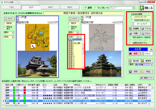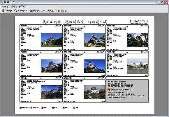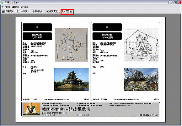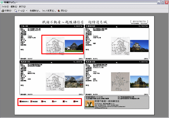 掲載する物件を選んだら「プレビュー」ボタンでチラシ画面を確認します。 「ファイル」>「印刷」して使う他、メールで送信することも出来ます。 やりなおしたい場合は「戻る」で編集画面に戻ります。 ![]()