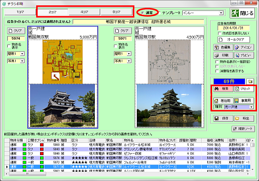 @dreamでは2物件・4物件・8物件、それぞれのチラシを作成することができます。 ポスティングに使ったり、店頭で配布したり、貼りだして使うなど工夫してみましょう。 チラシは「通常」と「テンプレート」と2種の作成ができます。 ※テンプレートはProgreV5以上で対応 チラシテンプレートの作成については「dream編 チラシ印刷7 チラシテンプレート利用」をご確認ください。