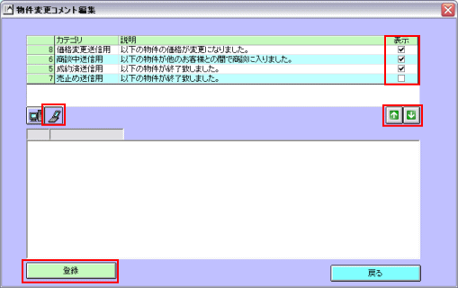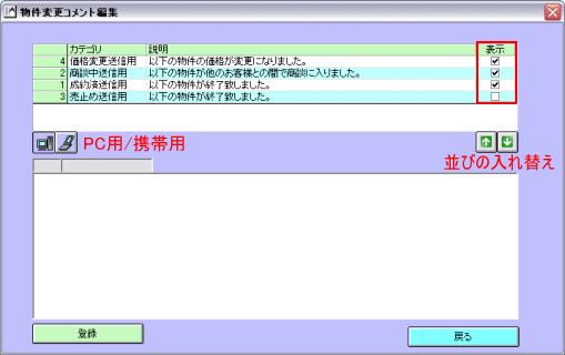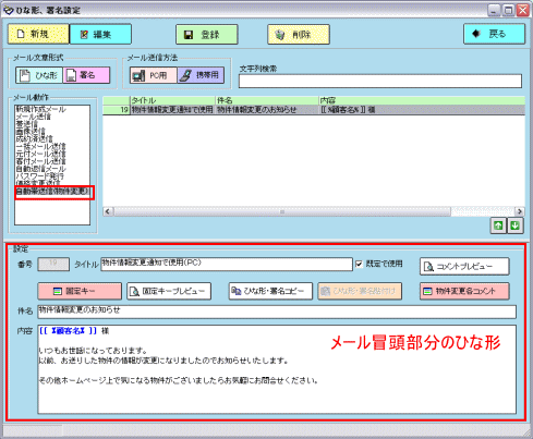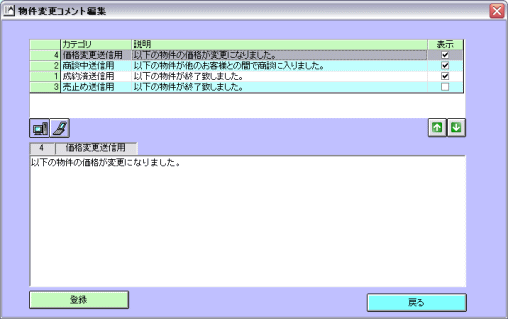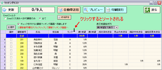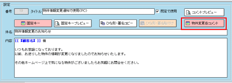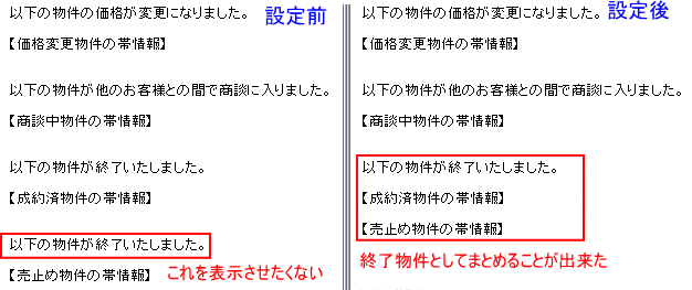 自動帯送信機能は手間がかからず大変便利な機能ですが、機械的になったり、お客様の都合や状況に合わせた きめ細やかな送信が出来ないなど、メール追客の観点から考えた場合、メリットとは言えない部分も含んでいます。 顧客マッチングからの帯送信や顧客ごとに確認して行うマッチングリストからのメール送信など、 これまでどおりの追客方法と上手く組み合わせ、効率のよいメール追客を行っていただきたいと思います。 ここでは自動帯送信機能を上手にお使いいただくための例をいくつかご紹介します。運用の参考にしてください。 ▼ひな形を工夫してお客様にわかりやすいメールにする 「物件情報変更通知メール」には、成約済・商談中・売止め・価格変更の情報が一緒に掲載されます。 【物件情報変更通知メールサンプル】 ※スペースの関係で帯情報部分は【】で省略しています ![]() 実際の物件情報変更通知メールはテキスト形式ではこのように送られます。 @dreamでは「成約済」と「売止め」を区別して管理しますが、購入できないという意味では、 お客様にとって「成約済」も「売止め」も同じなため、同じ説明文では分かりづらいかもしれません。 そこで「物件情報変更通知メール」のひな形を修正して、成約済と売止めをまとめることにします。 「メインメニュー」>「ツール」>「環境設定」>「メールひな形・署名設定」を開きます。 メール動作の中にある「自動帯送信(物件情報変更)」をクリックします。 ![]() 【物件情報変更通知メールサンプル】を参考に、冒頭部分の変更がある場合は編集>登録してください。 「物件変更各コメント」ボタンをクリックします。 ![]() 「物件変更コメント編集」画面が開きます。PC用物件情報変更通知メールの設定をします。 並び替えボタンを使ってメールで掲載したいカテゴリ順に並べ替えます。 ここでは「価格変更」「商談中」「成約済」「売止め」の順に並ぶよう設定してください。(今回はこの設定が重要です) ![]() 次に表示設定をします。ここでチェックを入れたカテゴリの説明文が「物件情報変更通知メール」で表示されます。 「売止め」の説明を表示させないことで「成約済」から境目なく終了物件の帯情報が掲載されます。 【設定前と設定後の物件情報変更通知メールサンプル】 ※スペースの都合で帯情報は【】で終了しています。 ![]() それぞれの説明文を編集する場合はダブルクリックで呼び出し、編集→登録してください。 ![]() 「携帯用」を選択して、順番、表示と同様の設定をしてください。「登録」>「戻る」で設定は完了です。 ![]() ▼顧客をランク付けして効率よく自動送信機能を利用する インターネット不動産ではメール追客は大切です。そこで@dreamの機能をフル活用して、 顧客の見込みに合わせて無駄なく効率的な追客をすることが必要になってきます。 期待できる見込み客については手動で送るメールの割合を多くして細かなメール追客をし、 見込みが薄い、冷やかしぽい、メールだけは送っておきたいといった顧客については 自動帯送信を利用して労力をかけずにメール追客を継続しておくといった運用も可能です。(推奨) ここでは顧客にランクを付けて、ランクに応じた追客をする方法をご紹介します。 「顧客カルテ」を開き、「ランク」をクリックして「ランクマスタ」を開きます。 ![]() 今回は例として顧客を以下のようにランク付けしました。 A:メール返信も早く、返信内容も優良であることから見込み度が高いと思われる顧客 B:今すぐ客ではなさそうだが適度に追客はしてみる価値がありそうな顧客 C:返信がこない、とはいえ配信停止依頼もなく見込みのかなり低い顧客 「ランクマスタ」でランクの設定が出来たら、実際に顧客データを呼び出し、ランクをつけていきます。 ※今後、新しく登録された顧客についてはランクを必ず入れることにし、見込みが出てきた、返信がなくなったなど 追客の状況に応じて顧客のランクは適宜、変更していきます。 マッチングリストから自動帯送信をします。「ランク」欄をクリックするとランクごとに並び順がソートされます。 「ランクC」の顧客のみを選択して「自動帯送信」します。手間をかけずにメールを送り続けることが出来ます。 ![]() 見込み度の高いランクAの顧客については、個々の顧客マッチングから優良な物件を選択し、 自分なりの説明を加えてメールを送る、ランクBについては反応を見ながら手動と自動送信を混ぜるなど 効率的なメール追客のやり方を工夫してください。 またランクAやランクBの顧客は基本の追客を手動で行い、物件情報変更通知のみ自動送信することも可能です。 顧客にランクをつけているとマッチングリスト上で対象の判別が出来るので非常に便利です。 「送信設定」で「希望条件マッチングメールを一括で送信する」のチェックを外し「保存」。 マッチングリストでランクABの顧客だけ選択し「自動送信」すると、物件情報変更通知