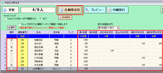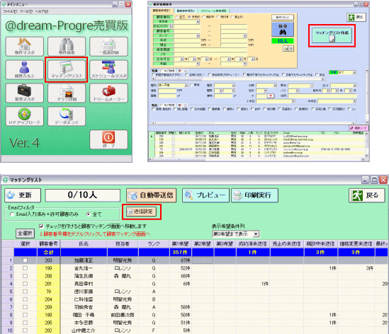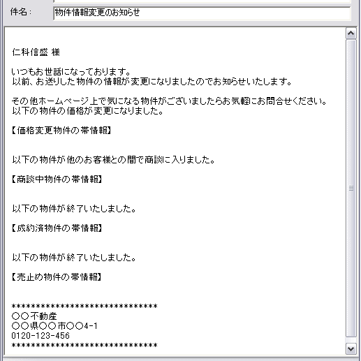 2011年1月リリースの売買版ProgreV4から自動帯送信機能がつきました。 ドリームメーラーをお使いの場合、マッチングリストから一括で帯送信を行うことが出来ます。 (マッチングリストの基本についてはこちらでご確認ください) 自動送信を行いたい対象顧客を選択欄から選んで「自動帯送信」ボタンをクリックすると、 該当する物件がある場合、「希望条件マッチングメール」と「情報変更通知メール」が一括自動で送信されます。 ![]() 希望条件に合う物件と商談中など情報変更に該当する物件があった場合、お客様のところには 以下のように希望条件マッチングメールと、情報変更通知メールの2通が送られます。 情報変更通知メールは1通のメールに成約済・商談中・売止め・価格変更の全てが含まれます。 ![]() ※便利な機能ではありますが自動送信の特性上、一律一括に送信される機械的なメールになりますので、 メール追客の有用性やお客様の都合を考慮した利用・運用をご検討ください。 ※こちらの機能はドリームメーラーをご利用の場合のみ、お使いになる機能です。 ドリームメーラーをお使いになる場合は@dream内でのメール設定が必要です。 設定手順につきましては@dream編 ドリームメーラー1、ドリームメーラー設定でご確認ください。 【自動帯送信機能について】 1、自動帯送信機能の送信設定 2、自動帯送信(今後継続して行っていただく操作) 3、自動帯送信の運用参考例