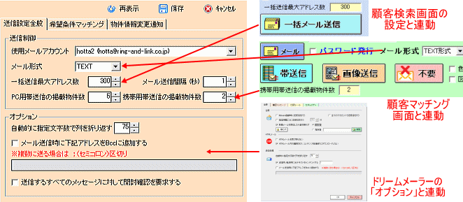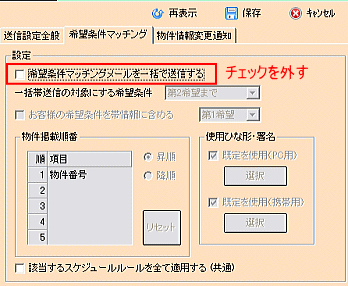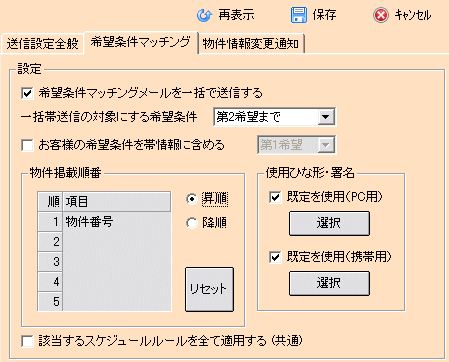 自動帯送信機能を使うための送信設定を行います。(今回は売買版の画面で説明しますが賃貸版も基本操作は同様です) 「メインメニュー」>「マッチングリスト」>「マッチングリスト作成」ボタン>「マッチングリスト」>「送信設定」ボタン ![]() 「送信設定全般」タブ内の設定を確認します。 すでにお使いの顧客マッチングやドリームメーラーの機能と連動した設定が多いため、 「送信設定全般」は特にご希望される設定がない限り、そのままご利用ください。 ![]() 【使用メールアカウント】 ドリームメーラーで既定に設定しているアカウントが表示されます。 【メール形式】 顧客マッチングで指定しているものが選択されます。設定を変えると顧客マッチングでも変更されます。 【一括送信最大アドレス数】 同一セッションで送るメール数を指定します。顧客検索の設定と連動しています。 【メール送信間隔】 1通ごとのメール送信間隔を指定します。1秒のまま特に変更する必要はありません。 【PC用帯送信の掲載物件数】 パソコンに送るメールに載せる物件数 (推奨は5件前後) ※希望条件マッチングメールは第1希望に合致する物件から1通につき設定した件数ずつ送信され、 物件情報変更通知メールは成約済・商談中・売止め・価格変更がそれぞれ指定した件数ずつ送信されます。 物件の動きが早く情報変更通知するものが多く、掲載物件数の設定も大きな数字を指定していると、 1通の物件情報変更通知メールの情報量が膨大になる可能性があることも考慮してください。 【携帯用帯送信の掲載物件数】 携帯に送るメールに載せる物件数 (推奨は2件〜3件) 顧客マッチングの設定と連動しています。 オプション欄はドリームメーラーの設定が反映します。特に必要がなければそのままで構いません。 (特に事情がない限り、お客様への開封確認要求は利用されないことをおすすめします) 次に「希望条件マッチング」の設定をします。 ![]() 【希望条件マッチングメールを一括で送信する】 希望条件マッチングメールを一括自動で送信する場合、チェックをいれます。 【一括帯送信の対象にする希望条件】 希望条件に合う件数が広く残っている場合、第○希望まで送るかを決めます。 ※希望条件に件数が残っている限り自動送信を行う都度、送信設定全般で設定した件数ずつ、 メールが送られます。お客様に条件と違いすぎる物件が頻繁に送られて迷惑だと思われ、 メール配信停止依頼が続出しないよう自社の運用に合わせて設定してください。 【お客様の希望条件を帯情報に含める】 希望条件マッチングメール内に、お客様の希望した希望条件を載せるか、載せないかの設定をします。 お客様の希望した条件を多くしすぎると帯情報以外の部分が増え、長いメールになることを考慮してください。 【物件掲載順番】 マッチングされた物件をメールに掲載する順番を指定します。「確認日」「登録日」「価格」などがお勧めです。 【使用ひな形・署名】 チェックを入れると「ひな形・署名」で帯送信の規定に設定したひな形が使用されます。 自動送信用に新たにひな形を作ったなどの場合はチェックを外し、「選択」から指定してください。 【該当するスケジュールルールを全て適用する (共通)】 チェックを入れるとスケジュールルールが設定されている場合、該当顧客に対して帯送信後のルールを適用します。 例:「最終メール送信から○日後にメールフォロー」というルールを設定している場合、 ここから自動帯送信を行ったことにもルールが適用されます。顧客マッチングでは適用確認のメッセージが 表示されますが、ここでチェックを入れると一括適用され、都度の確認は表示されません。 次に「物件情報変更通知」の設定をします。 ![]() 【成約済通知メールを一括で送信する】 過去に帯送信した物件で成約済に変更されたものを物件情報変更通知としてメール送信します。 【商談中通知メールを一括で送信する】 過去に帯送信した物件で商談中に変更されたものを物件情報変更通知としてメール送信します。 【売止め通知メールを一括で送信する】 過去に帯送信した物件で売止めに変更されたものを物件情報変更通知としてメール送信します。 【価格変更通知メールを一括で送信する】 過去に帯送信した物件で価格変更されたものを物件情報変更通知としてメール送信します。 【使用するひな形・署名】 チェックを入れると「ひな形・署名」で帯送信の規定に設定したひな形が使用されます。 自動送信用に新たにひな形を作ったなどの場合はチェックを外し、「選択」から指定してください。 以上の設定が出来たら「保存」をクリック、「はい」で設定を終了します。 ![]() 自動で「一括」送信する機能につき、一律、設定に基づいた送信が行われます。 一括送信の中で個別に「このメールだけは」「このケースだけは」といった設定はできません。