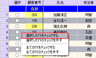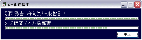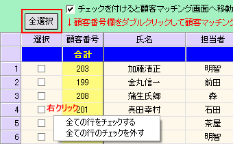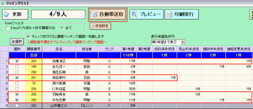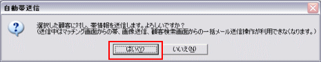 実際に自動帯送信を行います。こちらは今後、業務の中で継続的に行う作業になります。 自動帯送信は対象顧客の顧客カルテ上のチェックをつけたメールアドレスに対して送信を行います。 PC用、携帯用それぞれにチェックがある場合は同じ内容のメールが両方に自動一括で送信されます。 選択欄から対象顧客を選びチェックを入れ、「自動帯送信」のボタンをクリックします。 ![]() 確認画面が出ます。よろしければ「はい」をクリックします。 ※自動帯送信中は通常の帯送信他、一括メールなど他のメール送信操作はできません。 ![]() メール送信中には次のような画面が表示されます。送信中、@dreamでの作業は可能です。 ![]() 送信完了後、確認が出ます。結果確認を聞かれます。「はい」で確認してください。 ![]() 送信結果が表示されました。確認したら「×」で閉じると送信画面は終了されます。 ![]() 【顧客選択について】 選択欄上で右クリックで「全選択」「全解除」することもできます。 ![]() 「Shift」キーや「Ctrl」キーを押しながら右クリックして複数選択後右クリックすると ポップアップメニューから選択行のチェックすることができます。 ![]()
