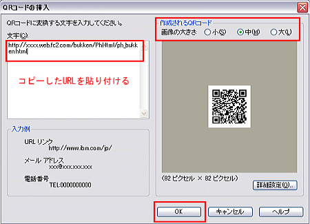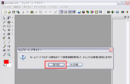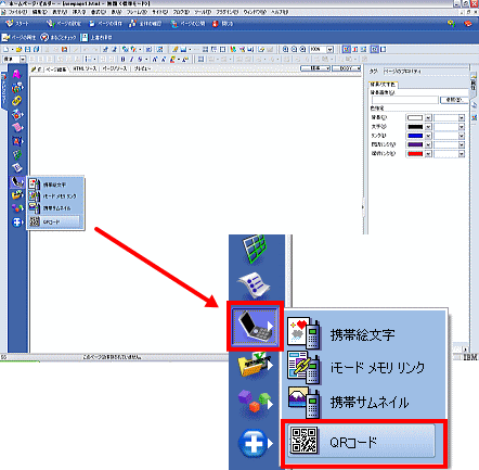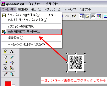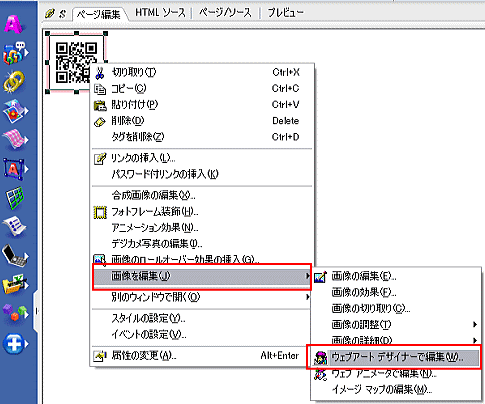 ホームページビルダーを起動し、「ファイル」>「標準モードで新規作成」で新規のページを開きます。 ※QRコード作成は「ホームページビルダーバージョン10」からの機能になります。 新規ページが開けたら、画面右側の「ナビメニュー」から「携帯」ボタンをクリック。 「QRコード」を選択して下さい。「ナビメニュー」がない場合、「表示」から「かんたんナビ」を クリックして表示させることが出来ます。 ![]() 「QRコードの挿入」画面が開いたら、先ほどコピーしておいた自社携帯サイトのURLを 右クリックで貼り付けます。「作成されるQRコード」で大きさを選択することも出来ます。 サイズが決まったら「OK」ボタンをクリックします。 ![]() 作成したQRコードの上で右クリックし、「画像編集」→「ウェブアートデザイナーを起動」します。 ![]() キャンバスの設定を聞かれたら「はい」を選択して進みます。 ![]() ウェブアートデザイナーに作成したQRコードが表示されたら、QRコードの上で一度、クリック。 QRコードが選択されたら、「ファイル」→「Web用保存ウィザード」をクリックします。 ![]() 「Web用保存ウィザード」からQRコード画像保存します。