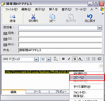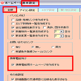 自分のホームページから物件一覧を開き、「携帯用HPアドレスを携帯に送信」をクリックします。 ![]() メールが開いたら、URL(これが自社の携帯サイトのURLになります)を左クリックしながらなぞり、 全て選択されたら右クリックで「コピー」します。 ![]() ※携帯サイトを作る設定にしていない場合、「HPアップロード」>「HP編集」>「HP基本設定」より 下記設定をして「保存」、一番上のアップロードをしてからの作業になります。 ![]()