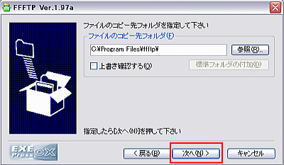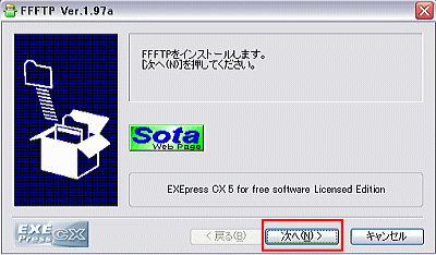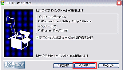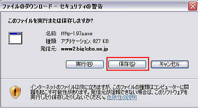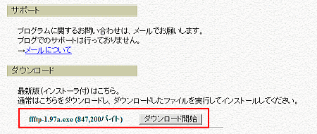 1、FFFTPの配布サイトを開きます。(FFFTPはフリーソフトです) ※Windows8の場合はこちらをお読みください。 ![]() 2、開いたページの中ほどに進み、「ダウンロード」項目の中にある「ffftp_1.97a.exe(847,200バイト)」 と書かれた横にある「ダウンロード開始」ボタンをクリックします。 ![]() 3、ダウンロード確認が出ます。「保存」をクリックします。 ![]() 4、「デスクトップ」を保存先として選択し、「保存」ボタンをクリックします。 ![]() 5、デスクトップに「FFFTPのインストーラー(実行ファイル)」が保存されました。 ![]() この時点でデスクトップにFFFTPのショートカットがある場合は、削除します。 ![]() 6、FFFTPのインストーラーをダブルクリックして、インストールを開始します。 【Vista/Windows7をご利用の場合】 インストーラーを右クリック「管理者として実行」から開始してください。 ダブルクリックで開始すると、正しくインストールされない場合があります。 ![]() 7、確認画面も「次へ」で進みます。 ![]() 8、インストール先の選択画面が表示されます。特に変更の必要がなければ、 そのままの状態で「次へ」をクリックします。 ![]() 9、最終確認画面で「次へ」をクリックすると、インストールが開始されます。 ![]() 新しいFFFTP(バージョン1.97a)がインストールされました。 ![]() 【Windows8をご利用の場合】 開発元での対応は終了しており、現在作成されているものは有志により作成されたものです。 @dream開発元として、フリーソフト「FFFTP」側の対応変更など今後の運用を考えた結果、 2012年より有償ソフト「NextFTP」をFTPクライアントとして推奨させていただいております。 FFFTP配布配布ページ上にはWindows8対応と記載されておりますが、上記理由により、 弊社では@dreamHPアップロード及び、ホームページビルダー利用時のアップロード全般について Windows8での動作確認は出来ておりません。 Windows8にFTPクライアントを入れる際は、NextFTPをお勧め致します。 FFFTPの配布サイトはこちら NextFTPの設定方法はこちら