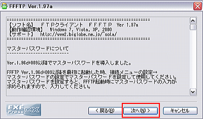 ※@dream最新バージョンをご利用でない場合、最新版のFFFTPを設定すると、 HPアップロードの都度、FFFTPマスターパスワードの手動入力が必要になります。 ホームページビルダーでトップページ(index.html)などを編集し、ご自分でFFFTPを起動して ファイルをアップロードする場合には起動時、毎回マスターパスワードの入力が必要となります。 その点をご了承の上、FFFTPを最新のものにしてください。 【ご注意】 FFFTPのメーカー開発は終了しており、現在配布されているものは有志により開発されたものです。 これに伴い2012年より弊社では、FTPクライアントソフトの推奨をNextFTPとさせてただいております。 現在、FFFTPをご利用中の方は引き続きご利用いただけますが、現行のフリーソフト「FFFTP」の ご利用についてセキュリティ面などのご懸念がある場合、またPC入れ替えなどで新規インストールを する機会などの場合には、有償ソフト「NextFTP」への移行検討をおすすめいたします。 ※FFFTPを最新版にする前に、必ずFFFTPの設定情報のバックアップを取ってください。 ・FFFTPの設定情報バックアップ ・FFFTP配布先(XP・Vista・Windows7) ・FFFTP配布先(Windows8) ・FFFTPマスターパスワードの設定 ・@dream本体にFFFTPマスターパスワードの設定
