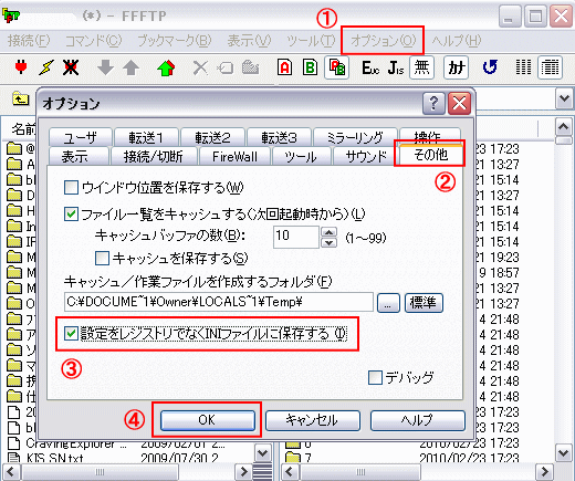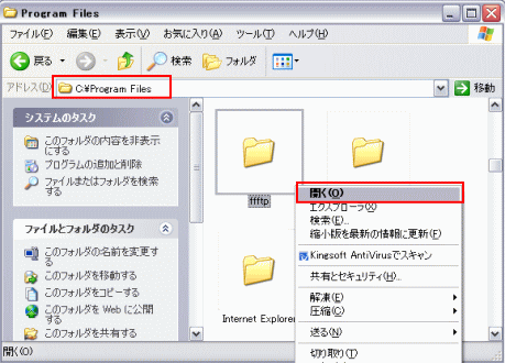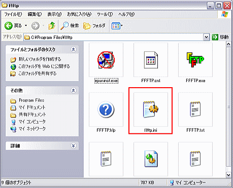1、FFFTPを起動し、「ホスト一覧」の画面で@dream2000 またはb_dream2000、t_dream2000のいずれかで接続します。 ※ここでは賃貸版の@dream2000を例にご説明します。 ![]() 2、左右に分かれた接続画面が出たら、「オプション」>「その他」をクリック。 「設定をレジストリではなくINIファイルに保存する」にチェックを入れ、「OK」をクリック。 FFFTPは終了してください。 ※すでにチェックが入っている場合は、そのまま「OK」で画面を閉じてください。 ![]() 3、マイコンピュータ(Vista/Windows7の場合はコンピュータ)をダブルクリックします。 FFFTPがインストールされているディスク(ドライブ)を開き、「Program Files」開きます。 ※ここではCドライブにインストールされているとして説明します。 ![]() 4、「ffftp」のフォルダを開きます。 ![]() 5、「ffftp.ini」と書かれたファイルを見つけます。これがFFFTPの設定ファイルになります。