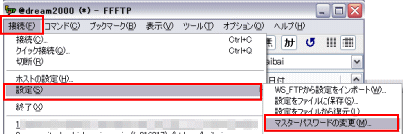 1、新しく出来たショートカットから、FFFTPを起動します。「ホスト一覧」の画面で@dream2000 またはb_dream2000、t_dream2000のいずれかで接続します。 ※ここでは賃貸版の@dream2000を例にご説明します。 ![]() 2、マスターパスワードを設定します。「接続」>「設定」>「マスターパスワードの変更」 ![]() 3、FFFTP最新版の初回起動時には、何も設定されていません。 自由なパスワードを設定してください。「OK」で設定を終了します。 ※マスターパスワードは必ずメモなどに控えておきましょう。 ![]() 4、FFFTP最新版を起動すると、マスターパスワードの入力を求められます。 3で設定した正しいマスターパスワードが入力されれば、FFFTPが起動します。 ![]()