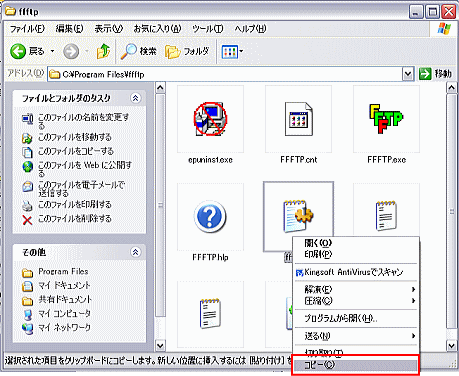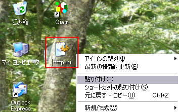 ![]() 6、「ffftp.ini」をコピーします。 ![]() 7、デスクトップに貼り付けます。貼り付け後、FFFTPのフォルダ画面は閉じてください。 ![]()