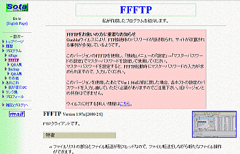 ウイルスの中にはFTP情報を勝手に盗みとり、サイトを改ざんしてしまうものがあります。 最新版のFFFTPではこの種のウイルス対策としてマスターパスワード機能が実装されています。 2010年以降リリースのFFFTPの特徴 FFFTPにマスターパスワード設定することにより、起動時にマスターパスワードの入力を求められる。 パスワード認証により、ウイルスによるIDとパスワードの盗み取りを防ぐことができるようになった。 FFFTPをご利用になる場合のご注意 下記バージョン以降の@dreamではFFFTPのマスターパスワードが設定できるため、 HPアップロードの都度、マスターパスワード入力を求められることはありません。