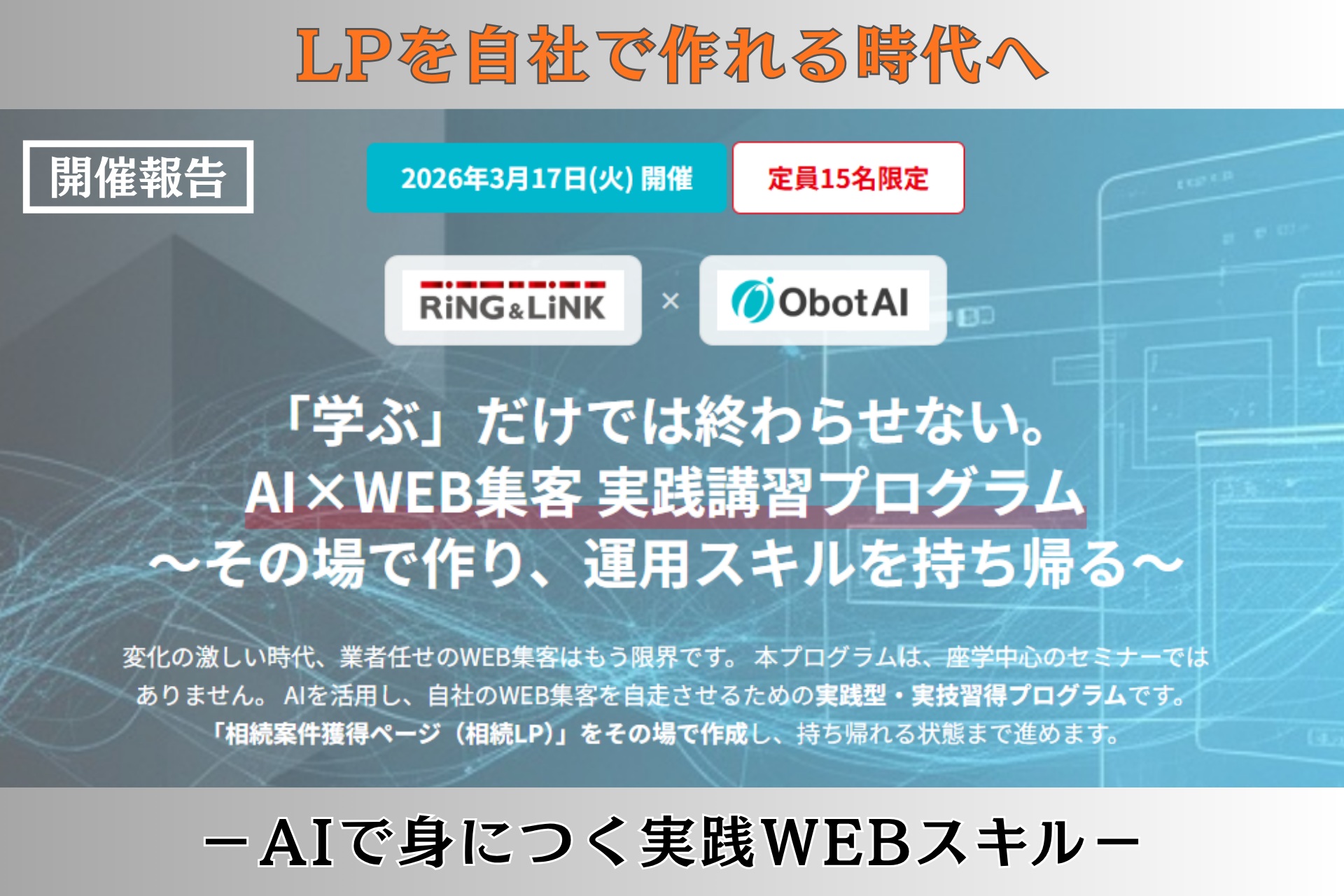 2026年3月17日(火)、株式会社ObotAI(本社:神奈川県川崎市、代表取締役社長:北見 好拡)と共同で、不動産会社向けの実践型ワークショップ「AI×WEB集客実践プログラム」を東京国際フォーラムにて開催しました。本プログラムでは、参加者がAIを活用しながら自社の強みを反映したランディングページ(LP)をその場で構築。不動産相続に関するLPを実際に制作し、知識習得にとどまらず、実務に直結する成果物の創出と内製化スキルの習得を同時に実現しました。