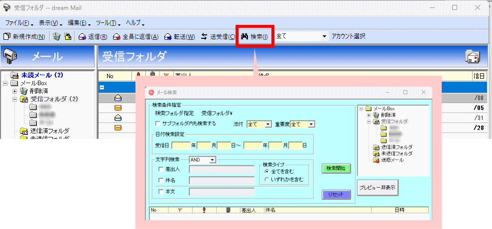 検索タイプが対象にするのは「差出人」と「件名」のみです。