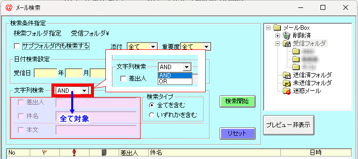 文字列検索の「AND」と「OR」は、「差出人」「件名」「本文」 全てを対象とします。
